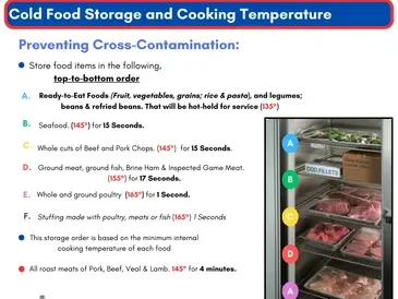 How to store food properly to stop cross-contamination, with cooking temperature requirements . (11"x17" Laminated & Waterproof Poster for Commercial Kitchens).